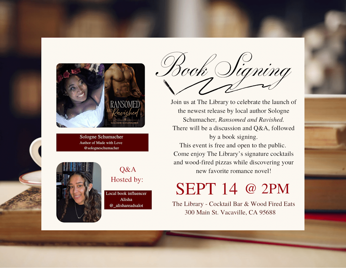 Join us at The Library to celebrate the launch of the newest release by local author Sologne Schumacher, Ransomed and Ravished.